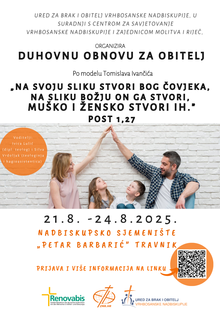 Nadbiskupsko sjemenište „Petar Barbarić“ u Travniku bilo je domaćinom višednevne duhovne obnove za obitelji, koja je održana u organizaciji Ureda za brak i obitelj Vrhbosanske nadbiskupije, te u suradnji s Centrom za savjetovanje Vrhbosanske nadbiskupije i zajednicom „Molitva i Riječ“. Voditelji duhovne obnove, koja je imala za temu „Na svoju sliku stvori Bog čovjeka, na sliku Božju on ga stvori, muško i žensko stvori ih“ (Post 1, 27), bili su gosp. Ivica Lulić, dipl. teolog, i gđa. Silva Vrdoljak, teologinja i hagioasistentica. Program i sadržaj ovog susreta, koji je trajao od 21. do 24. kolovoza 2025., slijedi su model pokojnog vlč. Tomislava Ivančića, utemeljitelja zajednice „Molitva i Riječ“ i hagioterapije. Kroz razmatranja, osobnu molitvu, sakrament pomirenja, slavlje Euharistije, klanjanje, razmjenu iskustava i zajedništvo sudionici su mogli ulaziti u ljepotu i spasenjsku dimenziju kršćanske antropologije, koja je utemeljena na stvaranju čovjeka kao muškarca i žene, te na čovjekovoj egzistencijalnoj upućenosti na Boga Isusa Krista, kojega susreće snagom Duha Svetoga. Za sve dane duhovne obnove za djecu prisutnih roditelja bio je pripremljen poseban program, koji je uključivao kako rekreacijske trenutke, tako i one odgojne i vjerske.