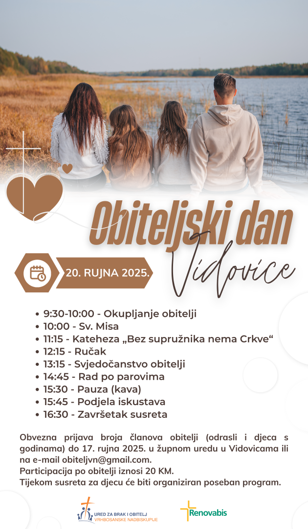Ured za brak i obitelj i Centar za savjetovanje Vrhbosanske nadbiskupije, u suradnji sa župom sv. Vida, organiziraju u Vidovicama obiteljski dan koji će se održati 20. rujna 2025., a na koji su pozvane sve obitelji koje žele provesti jedan dan ispunjen formativnim, duhovnim i rekreativnim sadržajima.